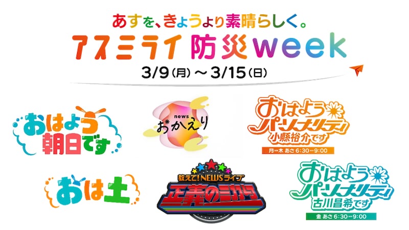 ABCグループは、3/9(月)~15(日)の1週間、「防災」をテーマに、テレビ、ラジオ、リアルイベントを横断する防災キャンペーン「アスミライ防災WEEK」を実施します。