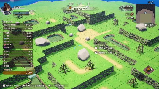 「里山づくり」では、畑を耕して作物を育てるほかにも、川をひいて水車を設置したり、家を建てたりと、特定の場所に建物や置物を自由に配置することができます。