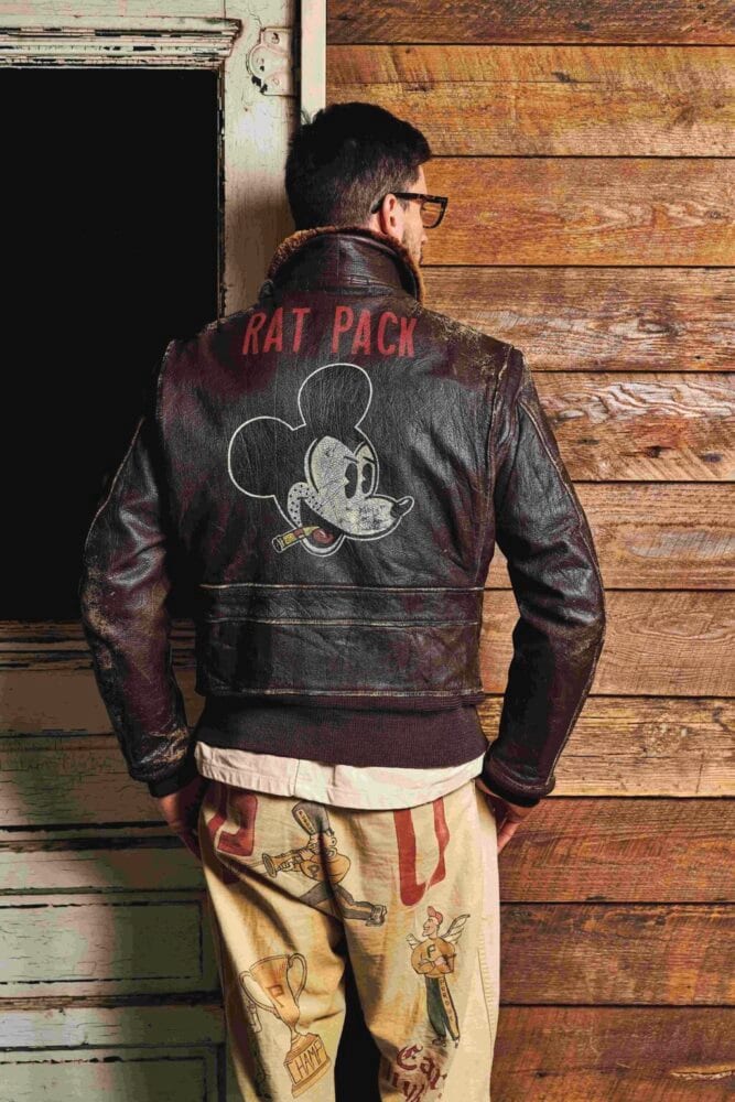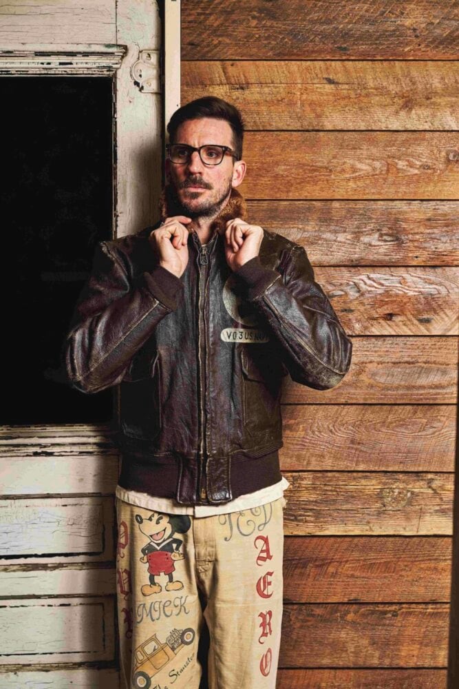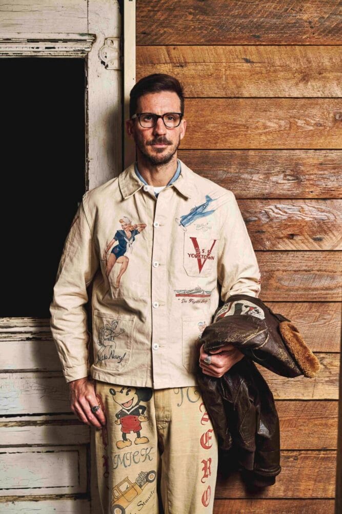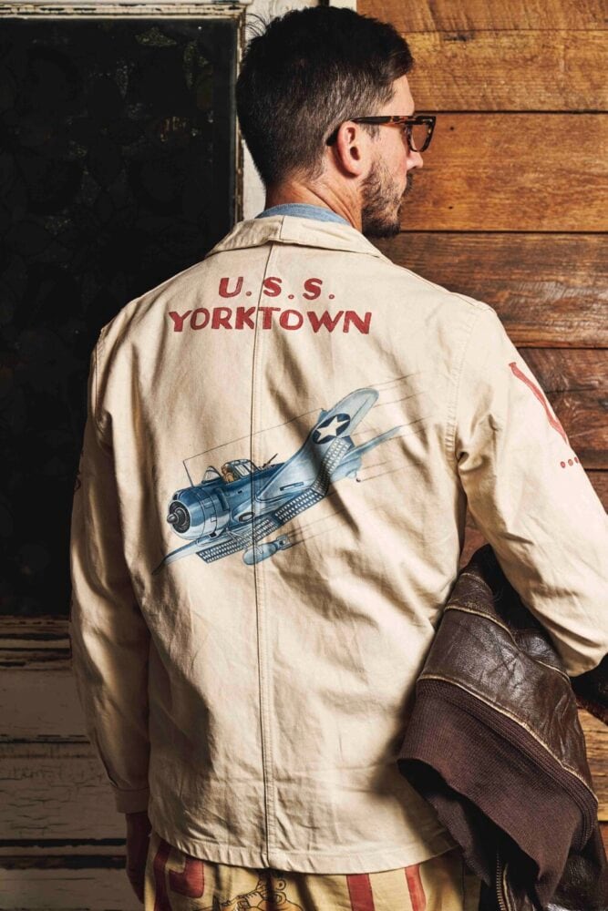 かつて、アメリカ海軍の兵士がしていたように、自らのチョアジャケットに色彩豊かな、しかも年代を感じさせるカスタムペイントを施した。実在した空母の名前、艦載機、さらにはピンナップガールと、稀有なヴィンテージピースのように見せるのも彼の技量があるからこそ。