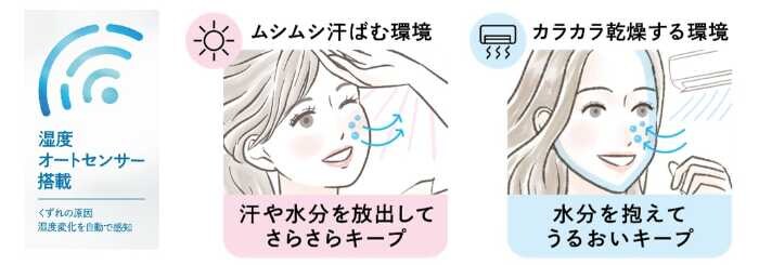 肌外部の湿度変化を自動で感知する「湿度オートセンサー」を搭載し、高温多湿の屋外でも乾燥しやすい室内でも快適な肌状態をキープします。