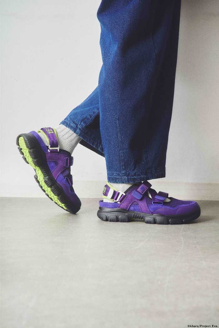 零号機を象徴するブルーをベースに、グリーンのラバーソールを組み合わせたデザイン。スウェードや踵ネオプレン、EVAソールにはグレイを採用し立体感を演出しています。