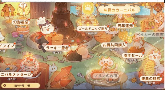 【ノルンの台所】:仲間と協力して食材を調理、時間内に料理を提出して得点を競い、にゃんこスタンプや、エッグコイン、女神のシャードなどの報酬を獲得可能。