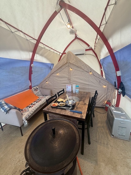 今の時期でもテントの中はストーブもあってしっかりと暖かいです😊