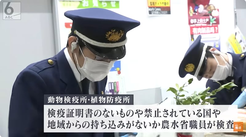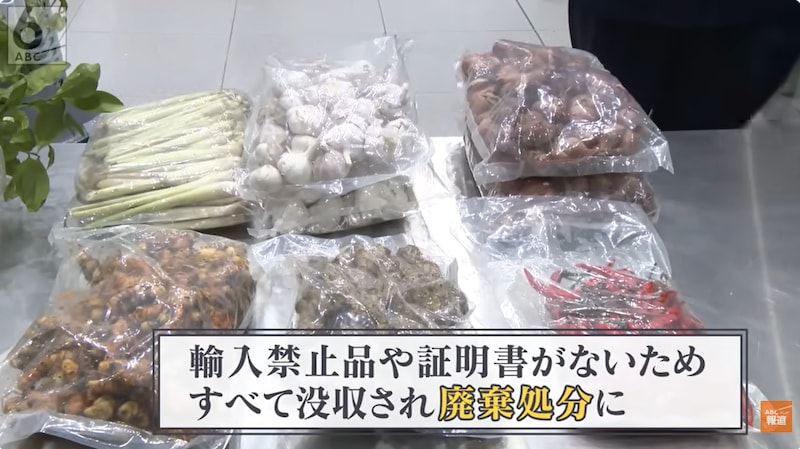 やって来たのは植物免疫所。海外から病害虫などが日本に入るのを防ぐため、野菜や果物などを検査しています。箱からは新たに、唐辛子やしょうがなどの野菜、柑橘類の苗が見つかりましたが、輸入禁止品であったり、ベトナム政府の発行する検疫証明書を男性が持っていなかったため、すべて没収され、廃棄処分となってしまいました。