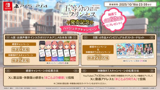 Nintendo Switch/PS5/PS4「五等分のプリンセス ~幻想と深淵と魔法学院~」の製品版、もしくは体験版のプレイした感想を、自身のXアカウントにて、専用ハッシュタグ「#ごとぷり感想」をつけて投稿で参加完了!