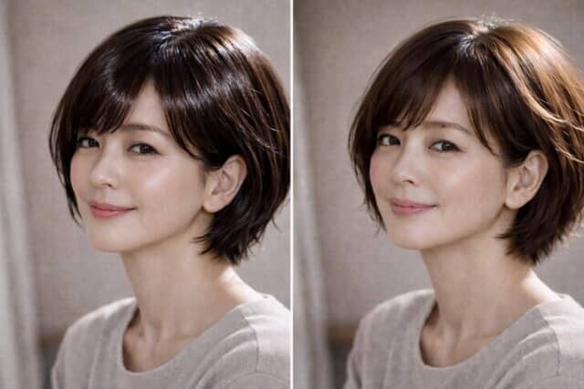 一方で、ツヤを抑えすぎると髪が乾いて見え、動きが止まった印象になります。特に大人世代は髪の質感変化が出やすいため、完全なマット仕上げは硬さにつながることも。めざしたいのは、しっとりでもウェットでもない中間の質感。内側はまとまり、表面はやわらかく動く。そのバランスがショートボブを軽やかに見せます。