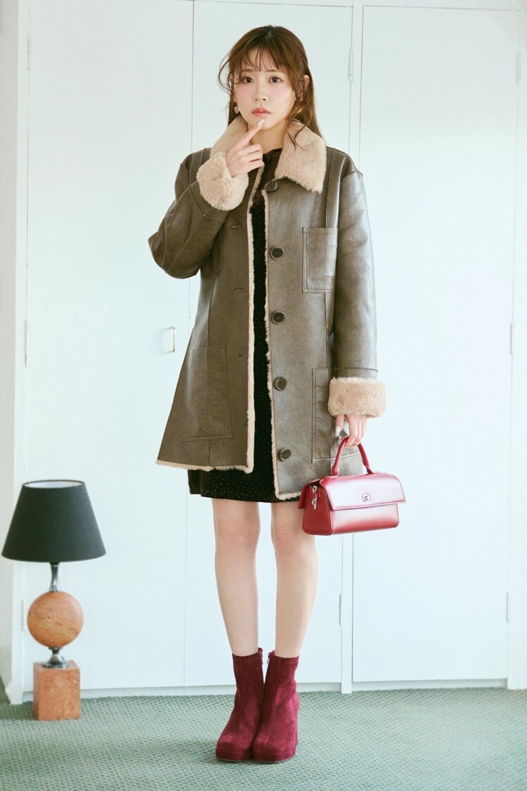 コートのなかに仕込んだ光沢感が上品なベロアのミニワンピ。コートと同じ色あわせでも素材感の違いをポイントにすればこなれた雰囲気に。