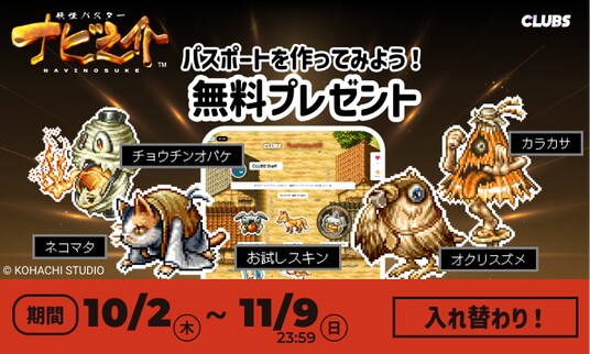 発売前から注目を集める『妖怪バスター ナビ之介』のドット絵が、ファン待望の”動くデジタルステッカー” になってCLUBSに登場!ここだけの妖怪やキャラクターが続々とラインナップされ、集めたステッカーはパスポートにコレクションできます。