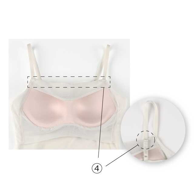 高めのネックラインで胸もとが見えにくく、調節可能なストラップによりアウターとも合わせやすいデザインになっています。