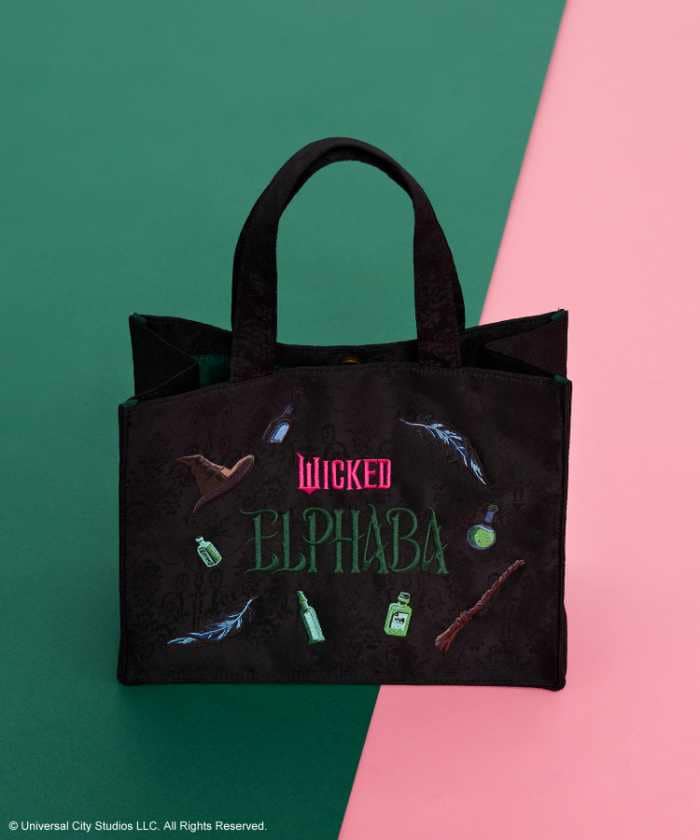 「ELPHABA/スクエアトート」は、カラーBlack、価格7,000円。ジャカード素材の落ち着いた雰囲気に、ほうきや帽子などの刺繍モチーフが映えるアイテム。