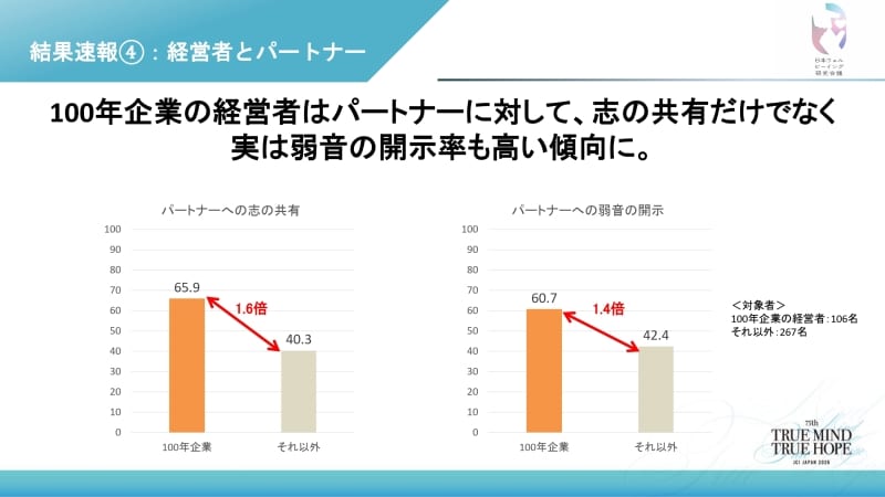 「驚くべきことに、100年企業の経営者は、パートナーと志を共有しているだけでなく、自分の『弱み』も開示している割合が高いという結果が出ました。6割以上の経営者が弱みを開示しており、他社に比べ有意に高いスコアを示しています」(大高氏)
