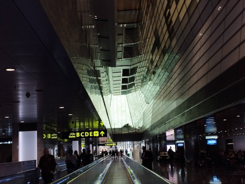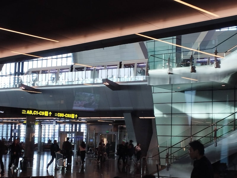 カタールのドーハ・ハマド空港は夜中も絶えず発着の案内が流れ活気あふれる空港。
