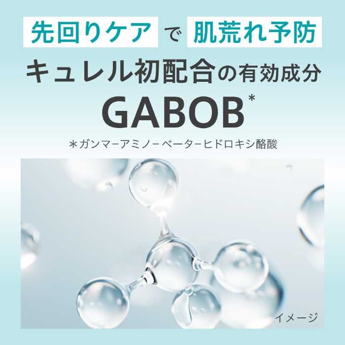 さらに、キュレル初の有効成分「GABOB*⁴」を配合。肌荒れや荒れ性を予防し、安定した肌状態へ導きます。ウォーターベース設計でさらりとなじみ、べたつきにくいのもポイント。