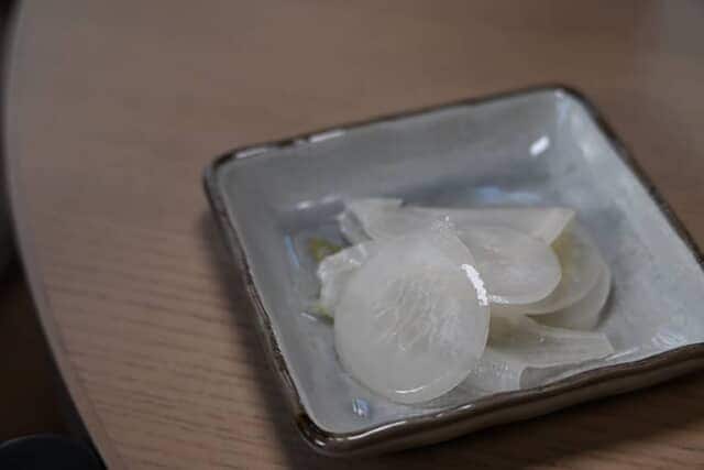 兜町は金融の街なので “株が上がる” のゲン担ぎも兼ねて「蕪の漬物」が添えられています。ホテルの自家製で、優しい酸味のシャキッとした食感は、兜町だからこそのさり気なく嬉しいメニューですね。