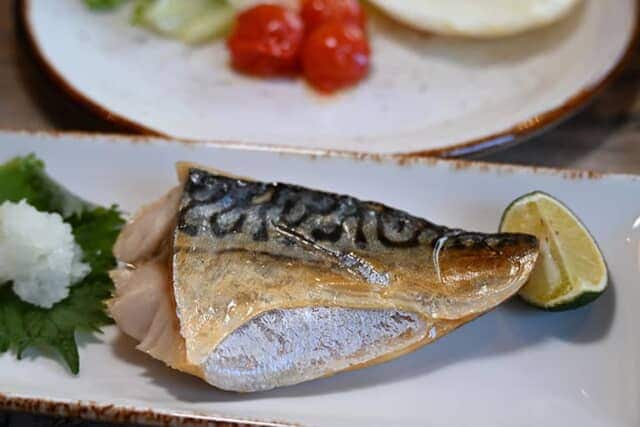 魚料理がつく和朝食。この日は鯖の塩焼きで、両面を4分ずつ焼くことでパリッとした皮とふっくらした身に仕上がります。優しい塩味もちょうどよく、ご飯がとても進みました。お魚は味噌サーモンなど日によって異なります。