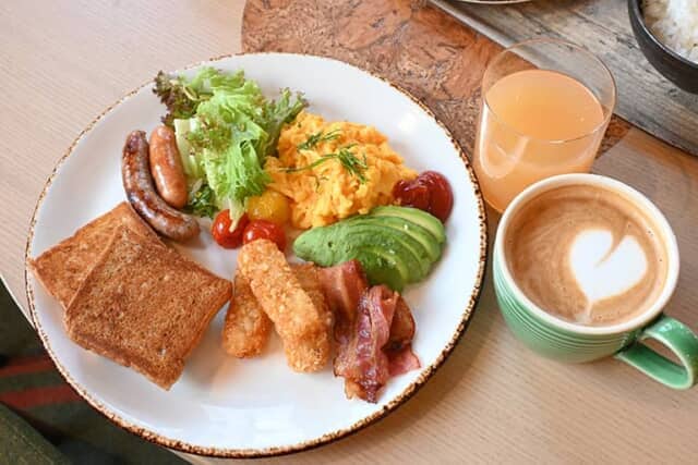お好みの卵料理とベーコン、ソーセージ、ハッシュドポテト、アボカド、サラダなどがセットになった洋食セット。卵料理はスクランブルエッグや目玉焼き、ゆで卵、ポーチドエッグから選ぶことができて、焼き加減もできる範囲で対応してくれます。