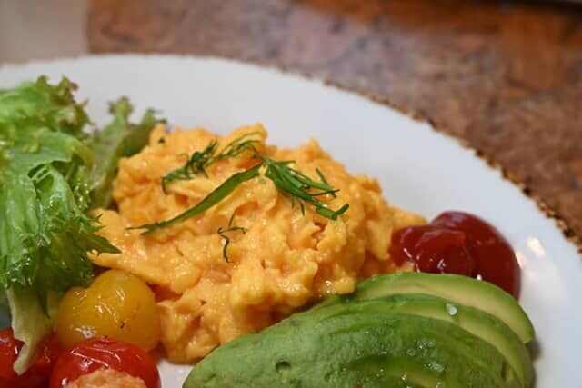 選べる玉子料理はスタッフイチ押しのスクランブルエッグを注文。焼き加減は普通、硬め、柔らかめから選べるので、普通をチョイスしました。生クリームが使われ、固めに焼かれた部分とトロリとクリーミーな部分が両方楽しめる仕上がりで、塩味の奥深い味わいの一品です。