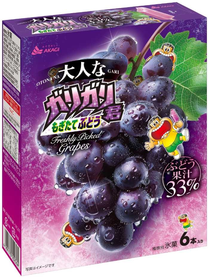 「大人なガリガリ君もぎたてぶどう」は、ぶどうアイスの中にジューシーなぶどう果汁かき氷を入れたアイスキャンディー。収穫して24時間以内に搾汁した、香り立ちの良いもぎたてぶどう果汁を使用しているのが特長です。