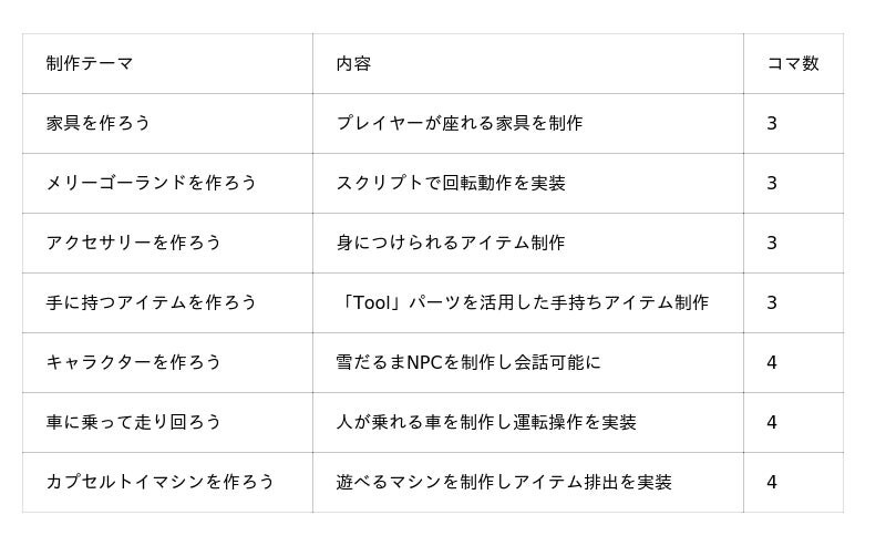 ・内容:最初の3コマはプログラミングを行わず、Blenderモデリングに集中。Roblox Studioへの取り込みや、スクリプトを加えた動きの実装を段階的に学習。
