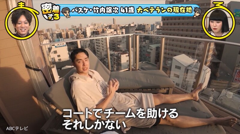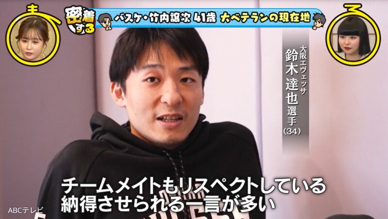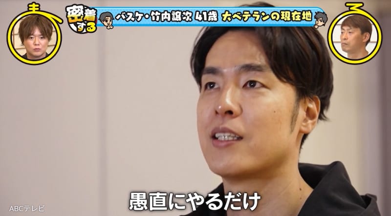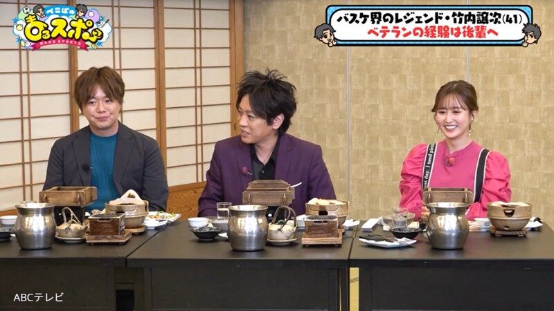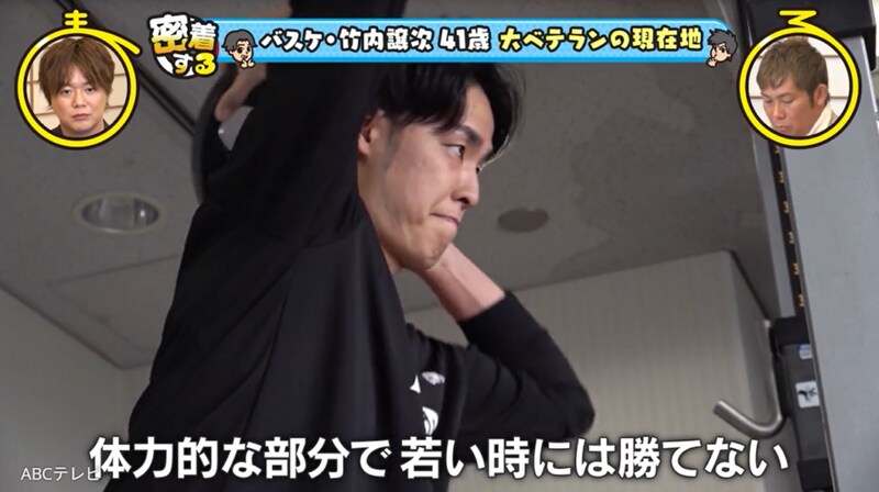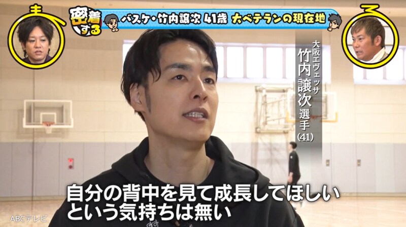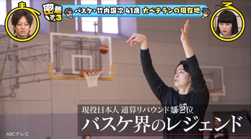 41歳のレジェンドとは、Bリーグ・大阪エヴェッサのキャプテン・竹内譲次選手のこと。大阪で生まれ育った竹内選手は、中学生でバスケットボールを始め、名門校・洛南高等学校でウインターカップを制覇し、大学生で日本代表選手となり、数々の国際大会で活躍。身長2メートル7センチの竹内選手に、お笑いコンビ・ぺこぱは、「天井届きそうじゃん!」「おっきい!」「かっこいい!」「年齢よりも若く見えない!?」などとビックリだ。