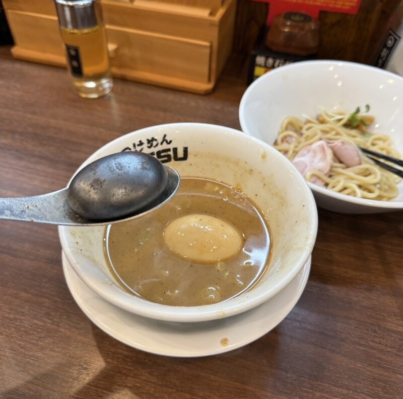 お昼のピーク時をはずしたこともあってか、混んでいたが行列はなし。500円で食券を買って、店員にInstagramをフォローしたスマホを見せる。ほどなく、つけめん+味玉が。