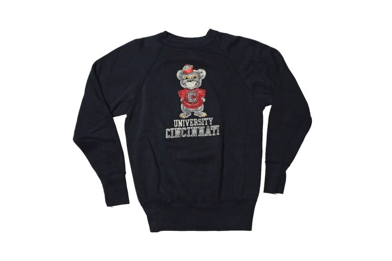 シンシナティ大学のフロッキープリントスウェット。「カレッジエイト」製のボディ。プリントの色残りも良好で、当時どのようなカラーで仕上げられていたのかが窺える。単なる古着としてだけでなく、資料としての価値も高い。AGE:1960s/BRAND:COLLEGIATE/ MATERIAL:ALL COTTON