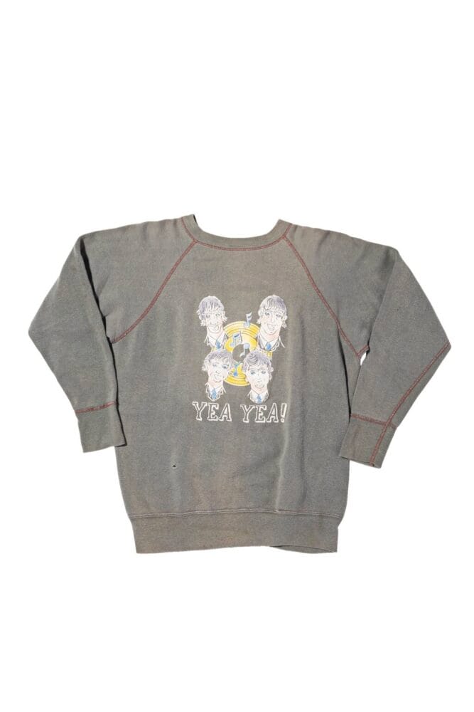 「YEA YEA!」のコピー、そして4人の顔のプリントが示す通り、世界を熱狂させたビートルズを想起させるカラーフロッキープリント。1960年代当時の人気や時代の空気を色濃く映し出す、カルチャー色の強い1着。AGE:1960s/BRAND:UNKNOWN/ MATERIAL:ALL COTTON