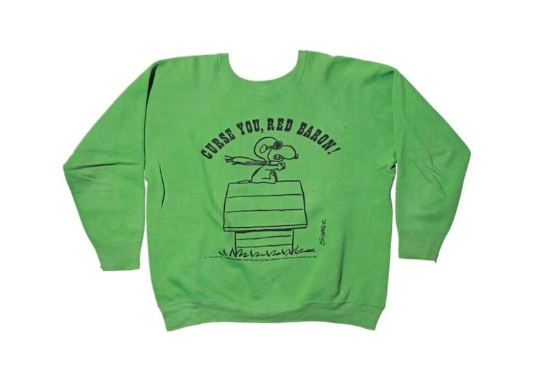 “CURSE YOU, RED BARON!”の名コピーと、ドッグハウス=戦闘機の空想設定を描いたピーナッツ屈指の人気図案。軽めのスプルースボディとラグランスリーブのバランスも当時らしい特徴を備えた1着。AGE:1960s/BRAND:MAYO SPRUCE/MATERIAL:ALL COTTON