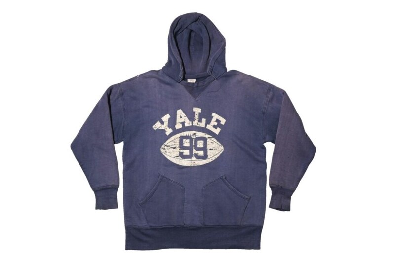 ATTACHED HOOD PARKA。2本針両V仕様、ダブルフェイスの後付けパーカ。アメリカの名門アイビーリーグの中でも一際人気の高いイエール大学のアイテム。カプセルナンバーのように、フットボールナンバーが正面に入るため、アメフトチームのものなのだろう。AGE:1940s/BRAND:CHAMPION/ MATERIAL:ALL COTTON