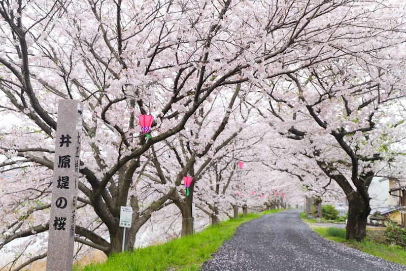 井原市にある「井原堤」は、桜の名所として知られる川沿いのスポットです。約2,000メートルにわたって続く桜並木にはおよそ800本の桜が植えられており、春になると川沿いの道を彩るように桜の景色が広がります。ゆったりと散策しながら桜を眺められる場所として、市民の憩いの場にもなっているスポットです。