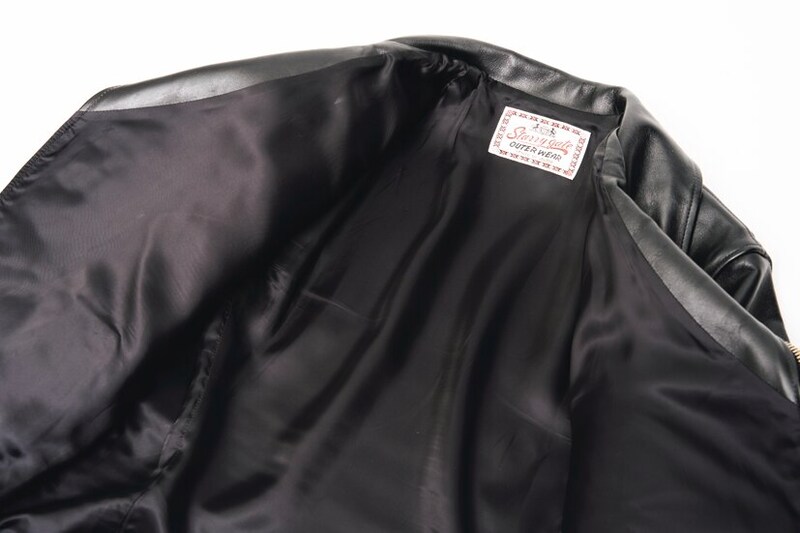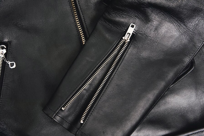 元はアメリカンライダースだが、袖のジッパーの取り付け位置は、英国系ライダースのように上付けとなっている。
