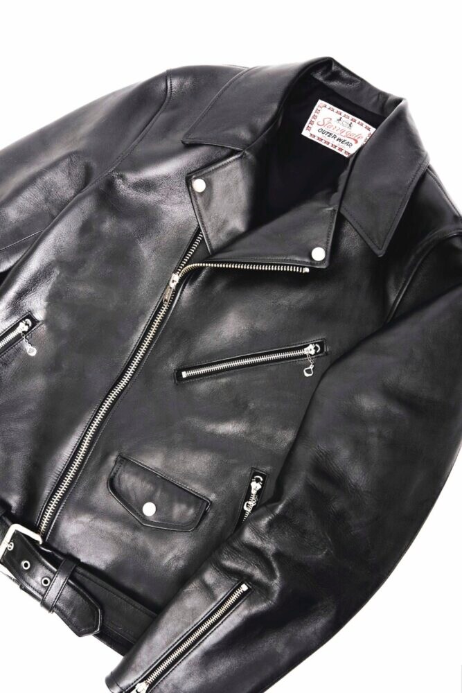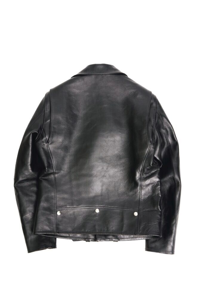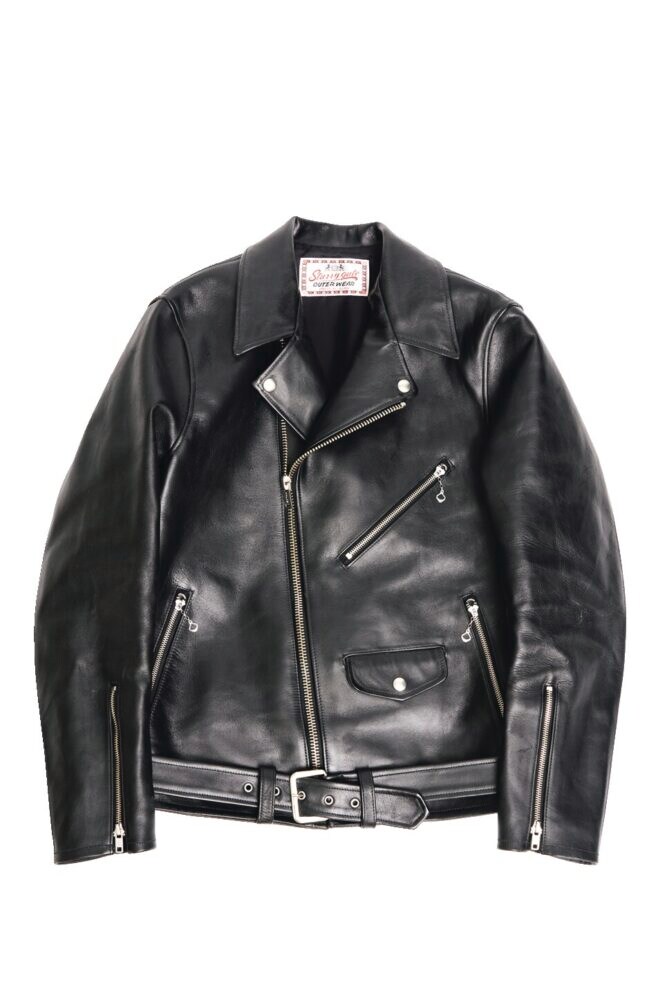 エポレットを省略し、スタイリッシュに着こなせるダブルライダース。素材はコンビ鞣し・セミアニリン仕様の1.6㎜厚のホースハイド。クロムで鞣した後、溶剤を洗い流して再度タンニンで鞣すことで、程よい重厚感としなやかさを堪能できるのが特徴。茶芯仕様なので、育て甲斐のある革ジャンに仕上がっている。ライニングもキュプラに変更しているので、着心地も良好だ。242,000円(ジェラード https://jelado.com)