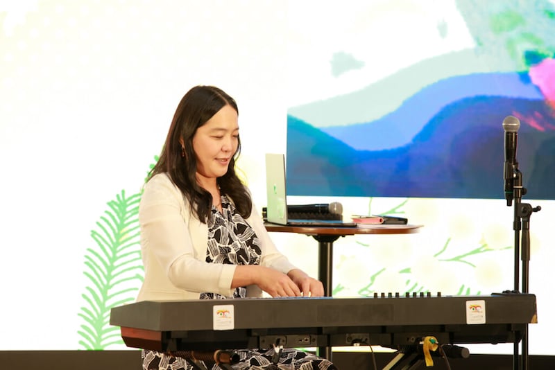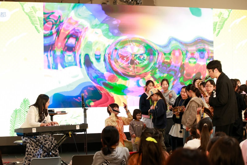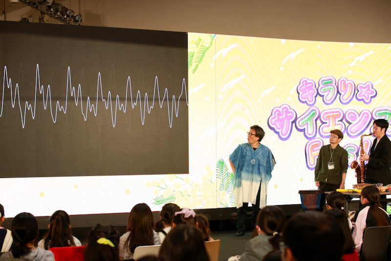 次のステージプログラムには、「大阪・関西万博」のシグネチャーパビリオン「いのちの遊び場 クラゲ館」のプロデューサーを務めた中島さち⼦(数学研究者・ジャズピアニスト・steAm代表)が登壇。ガンバレルーヤも引き続きサポーターとして参加し、「⾳が⾒える!? みんなで鳴らそう! ⾳のふしぎ発⾒ライブ」を実施。