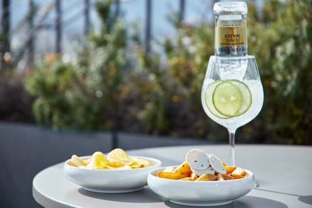 (左から)「黒トリュフポテトチップス」990円、「トリュフ風味のフライドポテト」1,430円、「K36 ジントニック」1,540円
