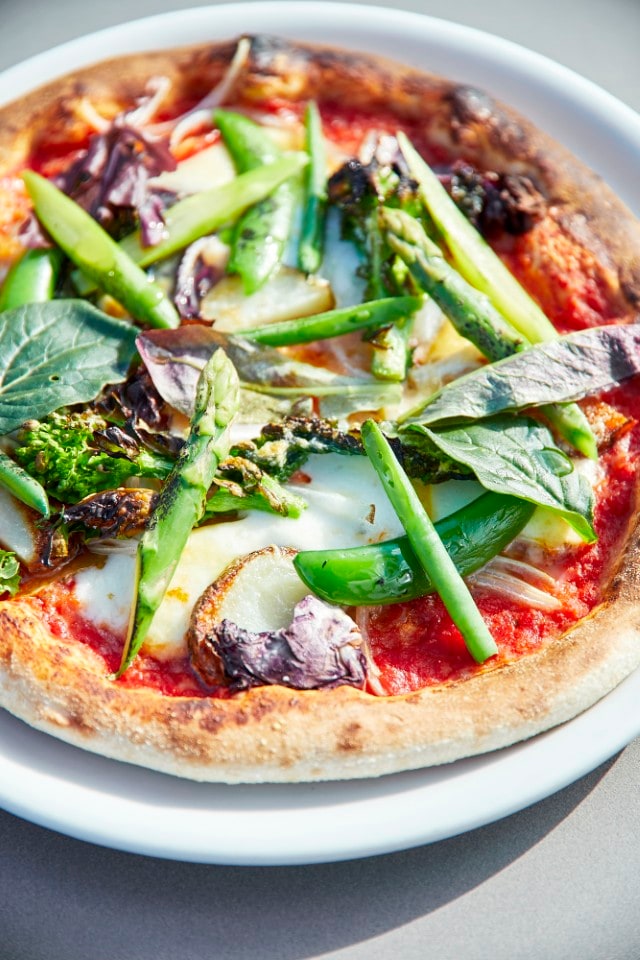 写真は春のおすすめメニュー。店内の窯で焼き上げたピザ「春野菜と燻製チーズのオルトナーラ」は、食感の異なるフレッシュ野菜の味わいが楽しいひと皿。豊かな風味のピザ生地と酸味のあるトマトソースがマッチしています。