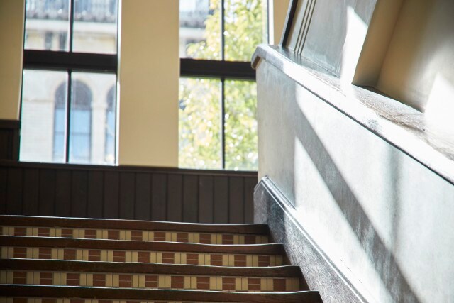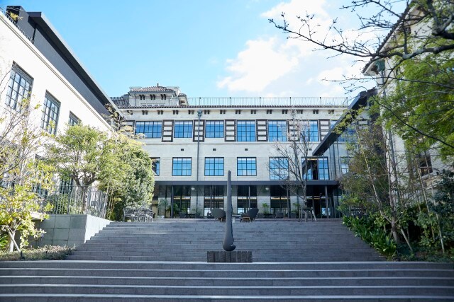 印象的な大階段も、当時の趣を残す意匠のひとつ。毎年春になると新入生を迎えていた桜などの植栽もそのままの景色をつくりだし、今では多くのゲストを迎えています。