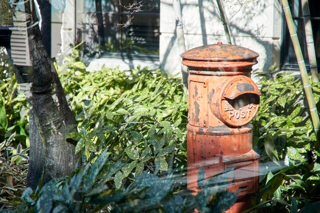 (左)校庭の隅にあった郵便ポスト。(右)宿泊者専用エリアにある階段。小さな傷がたくさん残る手すりに歴史を感じられます。