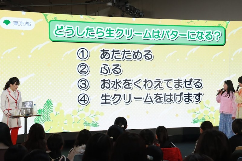 このプログラムでは、ペットボトルと生クリームを使って、とある方法でバターを作ると宣言。