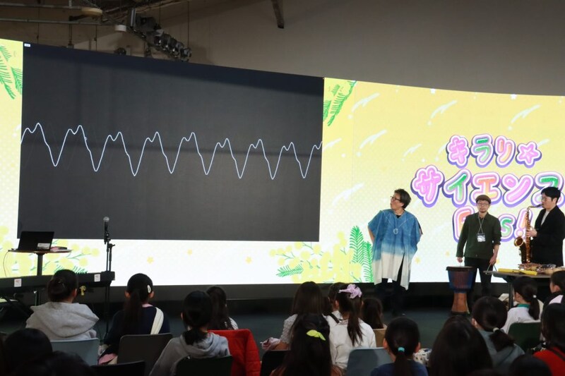 ステージにはMini KURAGE Bandも登壇し、音の波を視覚的に見ることができる「オシロスコープ」を使い、楽器や声の高音から低音まで、さまざまな音を表示。