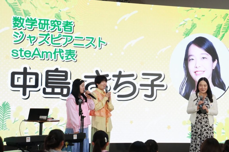 前のプログラムに引き続き、ガンバレルーヤのお二人と数学研究者・ジャズピアニストでsteAmの代表を務める中島さち子さんが登壇し「音が見える!?みんなで鳴らそう!音のふしぎ発見ライブ」を行いました。