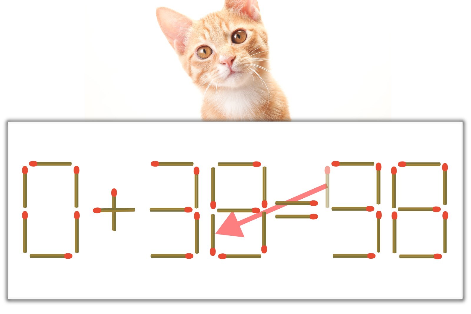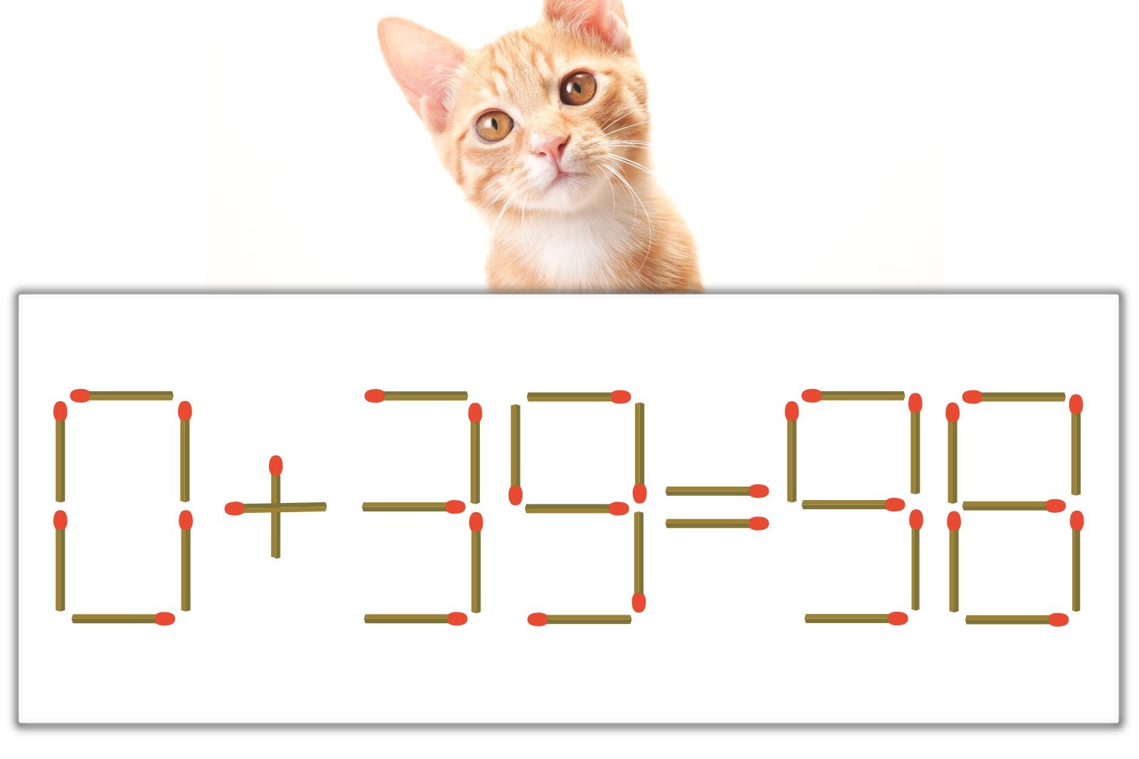 「9」のマッチ棒を1本、左下にスライドさせて「8」を作り、「0+38=38」にする。※解答は複数ある場合があります。