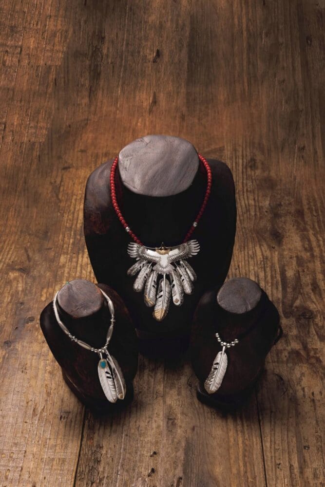 アリゾナフリーダムを象徴するイーグルとフェザー。組み合わせ次第で、さりげなく個性を演出。左/192,500円(鹿ヒモ込み)中央/1,017,280円(鹿ヒモ込み)右/58,190円(鹿ヒモ込み)