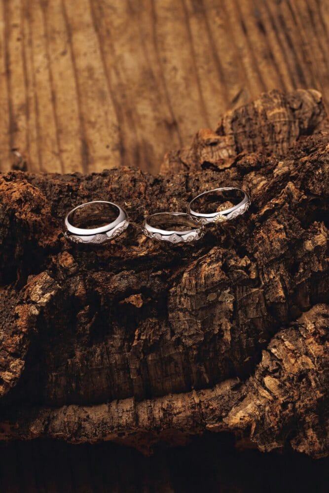 太陽と唐草をモチーフにしたリング。日々のコーディネイトに、ほどよい存在感をプラスしてくれる。左/19,800円 中央/13,860円 右/27,170円