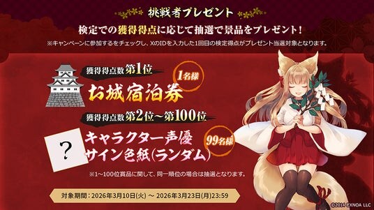 獲得得点第1位の方には「お城宿泊券」、第2位~第100位には「キャラクター声優サイン色紙(ランダム)」をプレゼントします。
