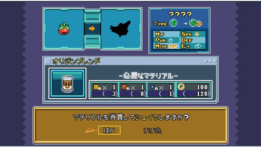 自由なカスタマイズ:冒険やバトルで得た「ブレンドレシピ(アイテム)」を使用することで、クリーチャーを別の姿へと変化させることができます。同じクリーチャーでも、レシピ次第で属性や外見が変化するため、自分好みに合わせた柔軟な育成が可能です。