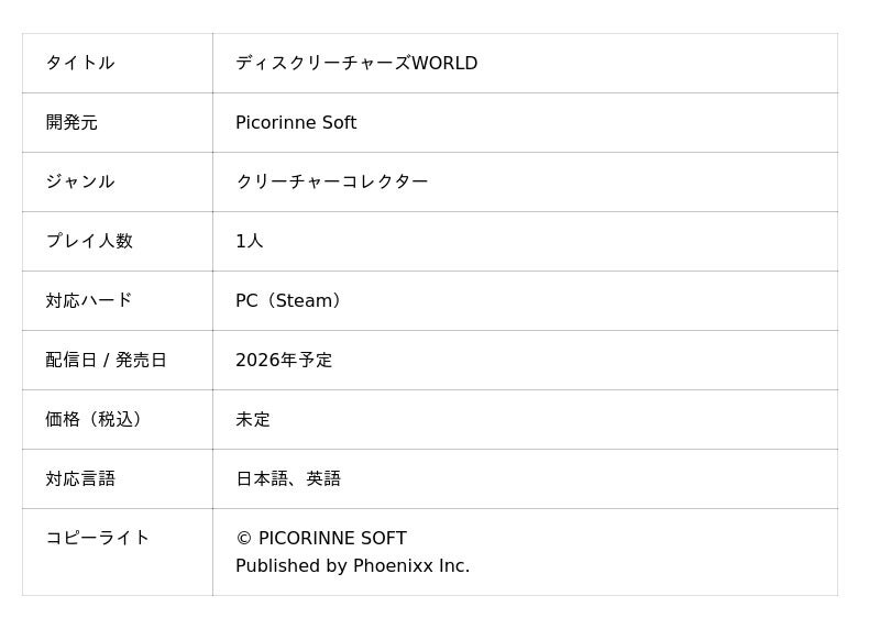株式会社Phoenixx(フィーニックス)(東京都武蔵野市、代表取締役社長:坂本 和則)は、開発チーム「Picorinne Soft」が手掛ける育成RPG『ディスクリーチャーズWORLD』のパブリッシングを決定いたしました。あわせて、Steamにて本作の「体験版」を公開いたします。