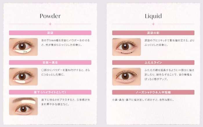 涙袋の影/ふたえライン/まつ毛の際/切開ライン/ノーズシャドウ/人中短縮メイク