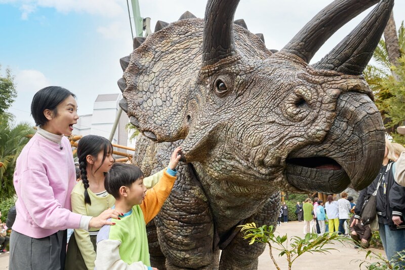 「ジュラシック・ワールド・ディノ・エンカウンター」は、トリケラトプス、ステゴザウルスという超大型恐竜を間近で見られるショー。見上げるほどの巨大な体は迫力満点ですが、なんと触ったり、鳴き声を至近距離で聞いたり、草を食べさせたりすることもできるんです。まさに映画「ジュラシック・パーク」シリーズの世界に入り込んだかのような気持ちに!