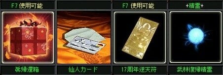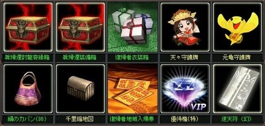 眞帰還封龍奇縁箱/眞帰還装備箱/復帰者衣装箱/天々守護牌/元亀守護牌/絹のカバン(30)/千里縮地図/復帰者地域入場券/優待権(特)/逆天符(幻)