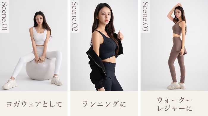 脚のラインを美しく見せるシルエットや、ヒップラインをさりげなくカバーできるスカート付きタイプなど、フィットネスウェアに挑戦しやすいデザインが揃っています。